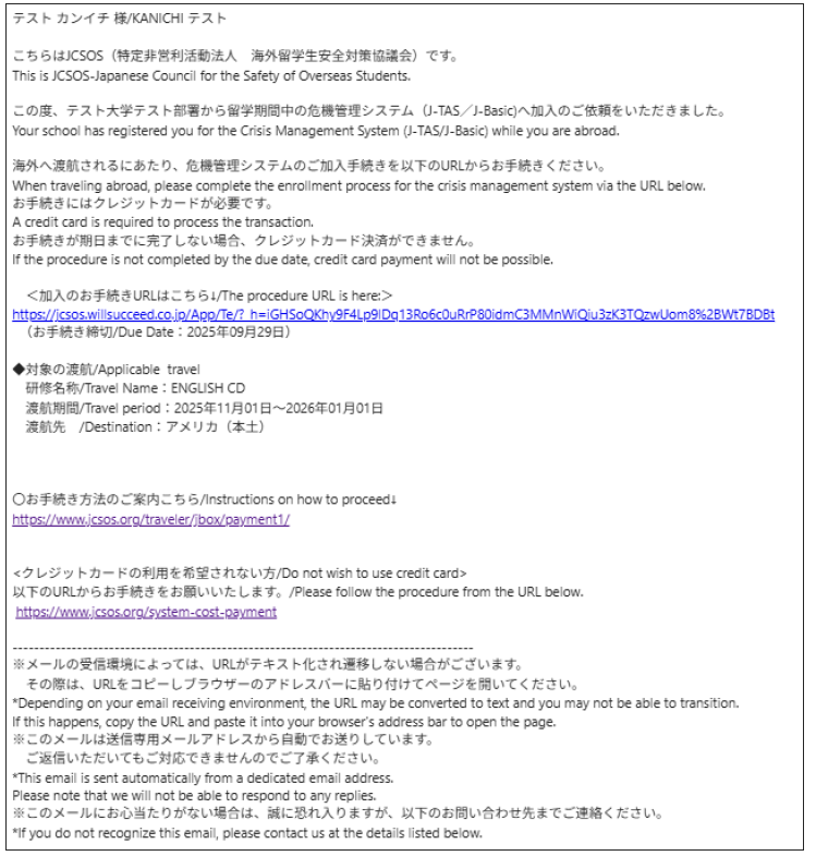 ■J-Boxからの費用支払案内メール(渡航者負担がある場合)